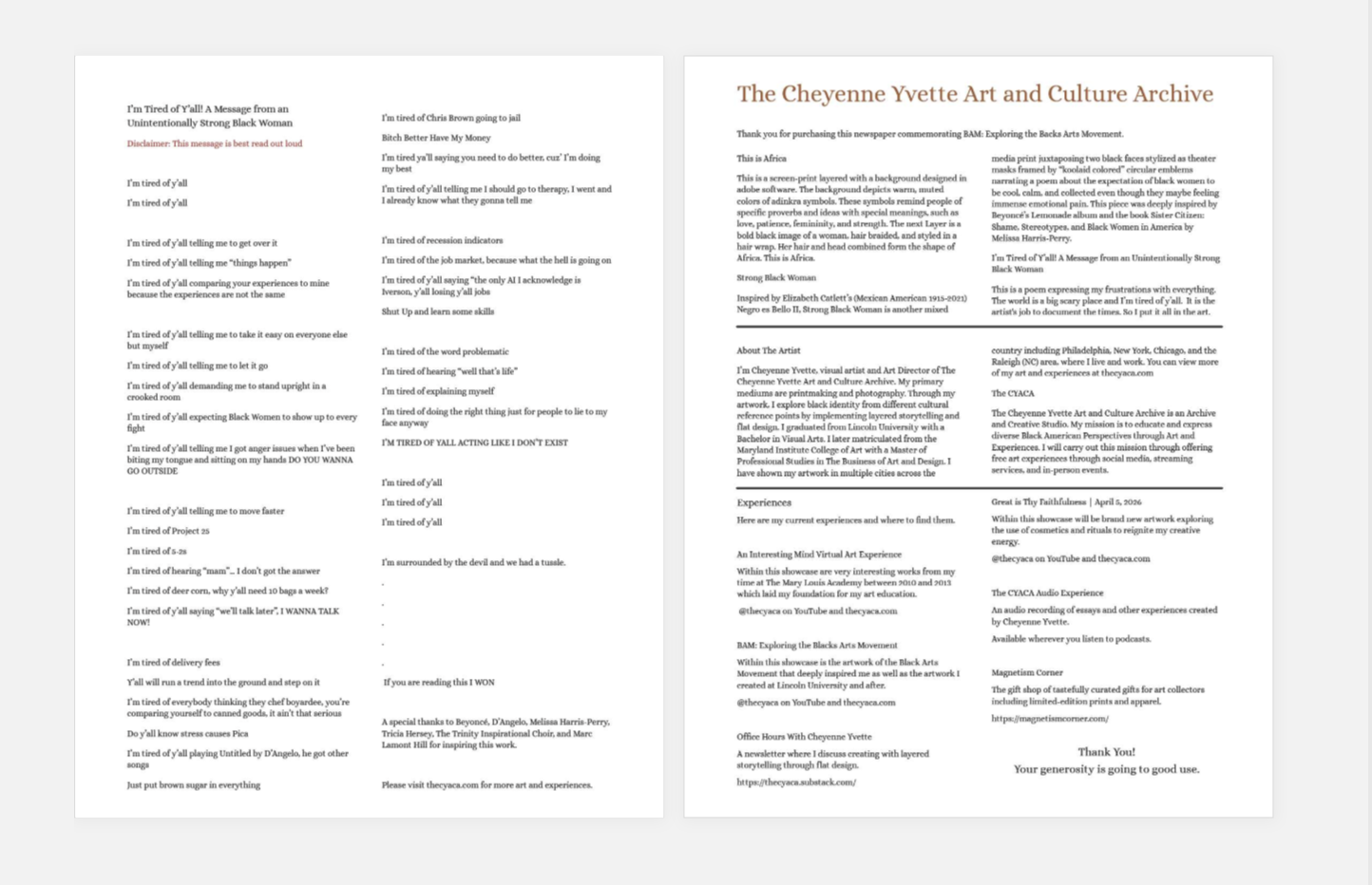 The BAM Archival Newsprint is a limited-edition, 4-page tabloid-style newsprint designed and curated by Cheyenne Yvette. This isn’t just a supplement to the experience; it is a physical artifact for your personal archive, printed on smooth mid-weight paper that honors the tradition of visual activism.